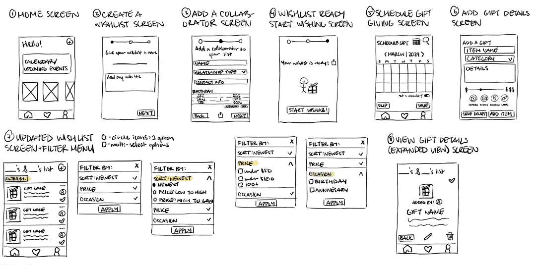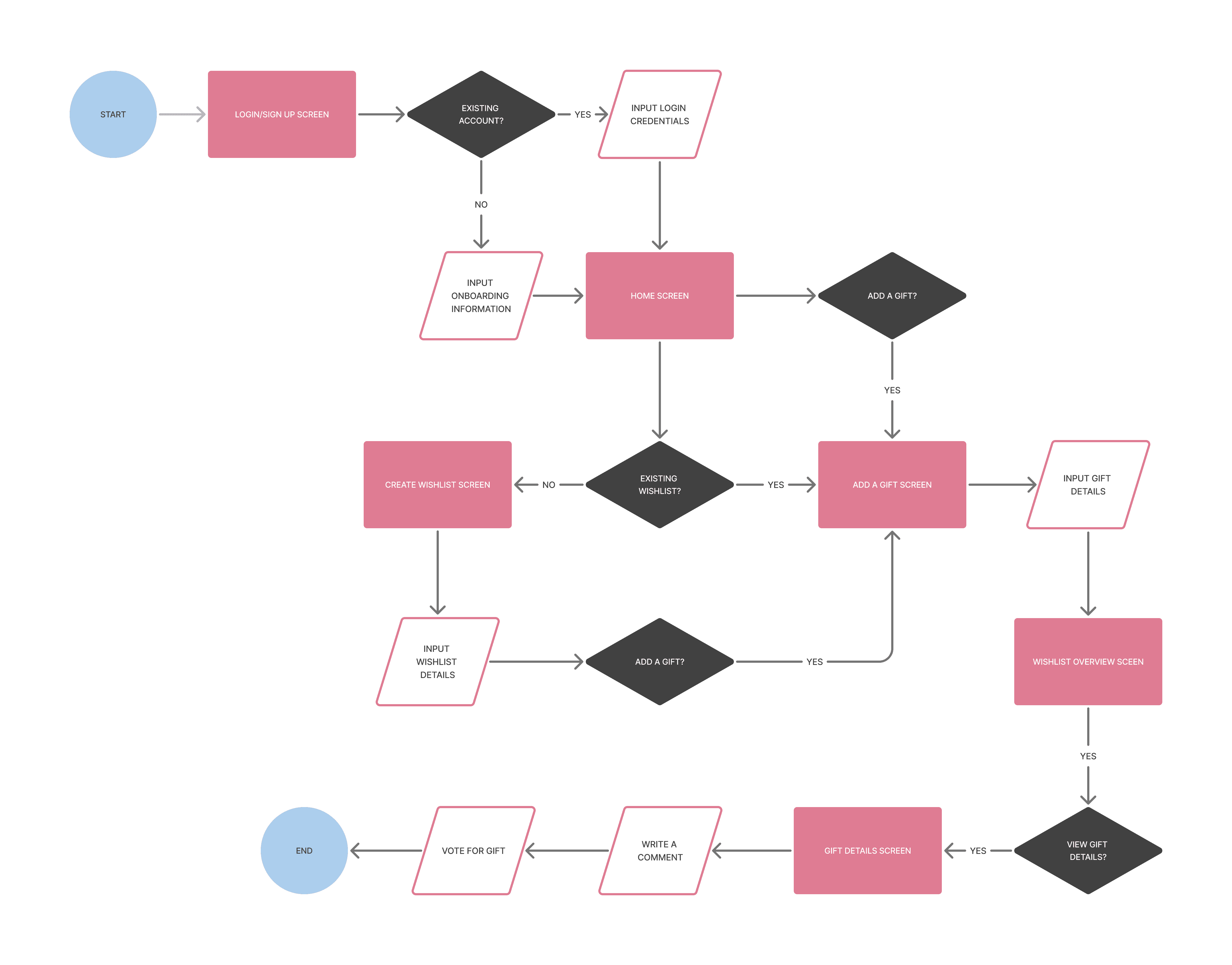 With the priority features in mind, I mapped out potential user task flows to explore how a user would initiate a collaborative wishlist and proceed to add an item to it. I selected this task to highlight the app’s MVP features.