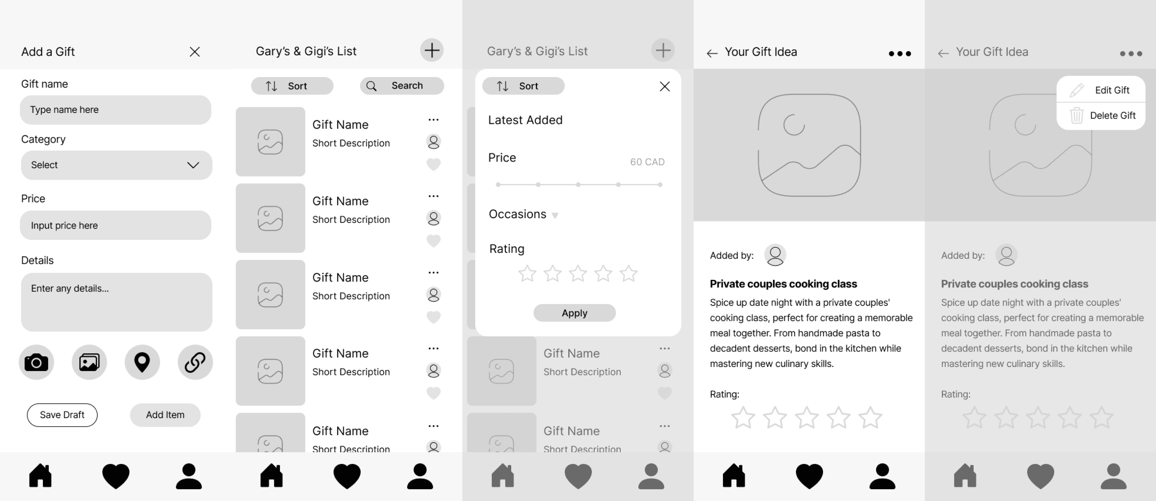 The focal point of our solution is a collaborative wishlist. By providing both users with insight into the other person’s preferences, it alleviates the uncertainty, pressure, and anxiety behind gift-giving without taking away the surprise and delight.