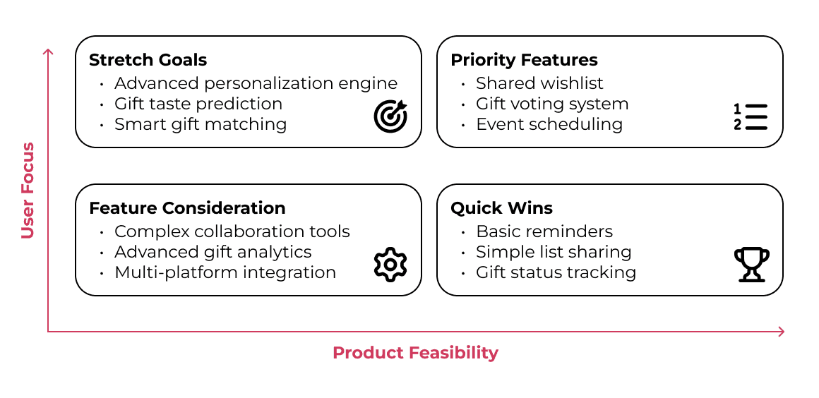 I led the team in a brainstorming session where we wrote down every potential features the app could include. Each prompt was evaluated based on its impact and feasibility, allowing us to plot them on the prioritization matrix. This approach ensured that our design decisions were data-driven, focused on high-value features, and aligned with user needs and project goals.